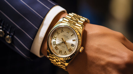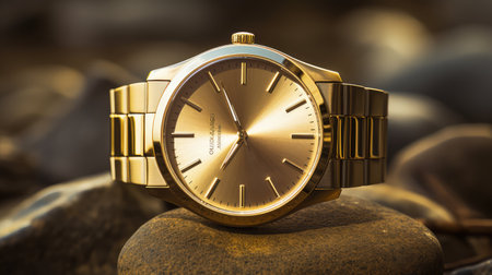 A close-up captures a golden wristwatch on a person's wrist, the focus sharp on the watch face. The scene uses warm lighting, possibly sunlight, with a soft-focus backdrop. This image could be suitable for promotional materials, articles related to fashion, or themes of time and luxury.