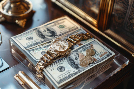 A luxury watch and a stack of cash on an upscale desk, symbolizing the correlation between time and money.