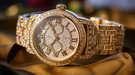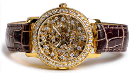 A diamond-encrusted watch resting on a leather surface, the intricate design and sparkling diamonds symbolizing sophistication and timeless style.