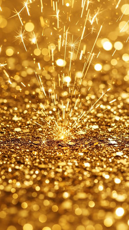 Backgrounds/ showing bright golden sparks erupting from a glittering surface with a bokeh effect of out-of-focus golden circles creating a festive and celebratory...