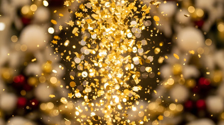 Explosion showing explosion of gold silver and holographic glitter and confetti in various shapes including stars and circles with soft bokeh lights in the...
