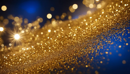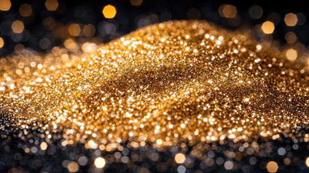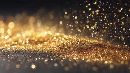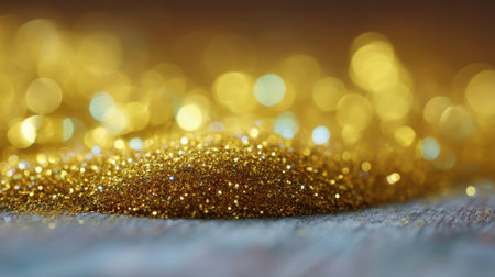 A stunning close-up view of shimmering gold glitter scattered across a vibrant surface, ideal for celebrating festive moments, artistic designs, and creative projects.