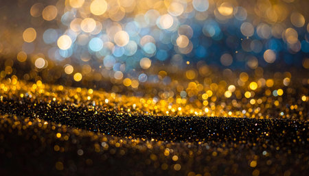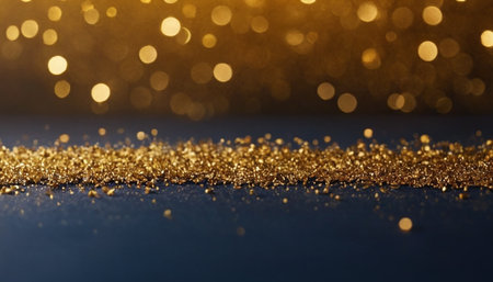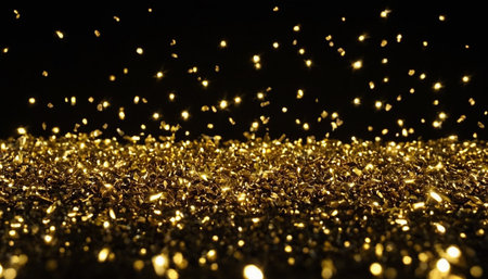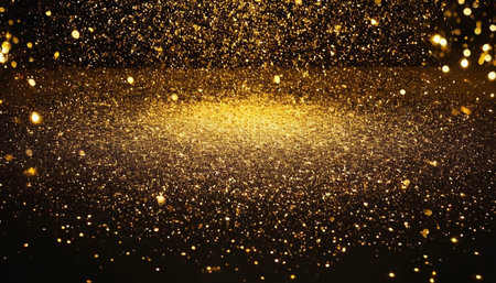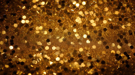 Golden sparkles cover a dark surface reflecting light and creating an enchanting display.