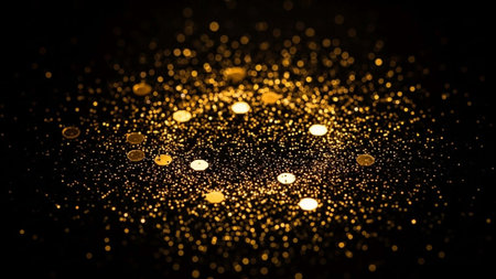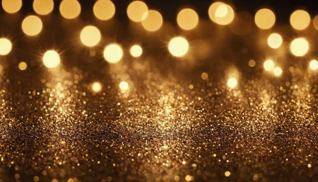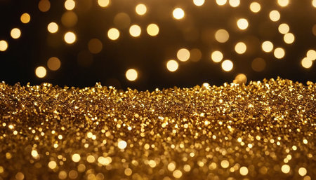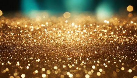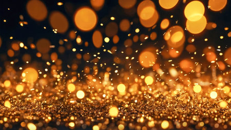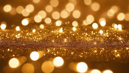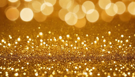 A close-up view of sparkling gold glitter creates a abstract background with soft, glowing bokeh lights in various sizes.