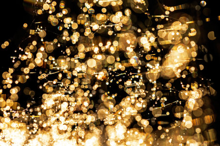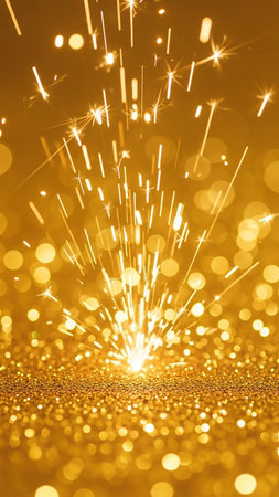 Backgrounds/ showing bright golden sparks erupting from a glittering surface with a bokeh effect of out-of-focus golden circles creating a festive and celebratory...