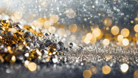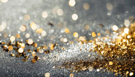 This enchanting decorative abstract background showcases dazzling silver and golden glitter combined with a soft blurred bokeh effect, evoking elegance and warmth, ideal for Christmas, New Year,
