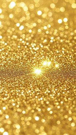 Year showing close up macro shot of shimmering golden glitter with bright starburst light effects and bokeh circles creating a festive and sparkling background...