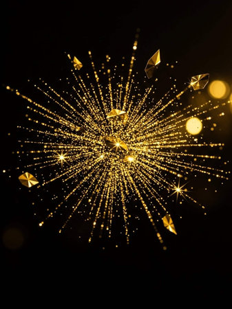 Vibrant showing a vibrant explosion of golden and silver confetti and glitter bursts outwards from a central point creating a energetic, and celebratory abstract...
