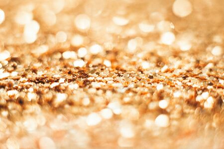 Abstract shining glitters golden holiday bokeh background with copy space. Defocused lights backdrop, selective focus with shallow depth of field. Christmas and New Year wallpaper decorations concept.