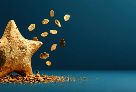 A close-up captures a golden star with scattered, similar elements against a deep blue backdrop. The image showcases textures, likely with studio lighting creating highlights and shadows. It suggests a festive or celebratory theme, suitable for various design projects, marketing materials, and editorial content.