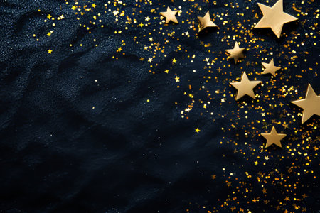 This captivating image features golden stars and sparkling confetti against a dark background, perfect for festive celebrations and event promotions.