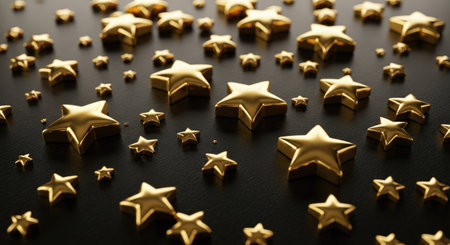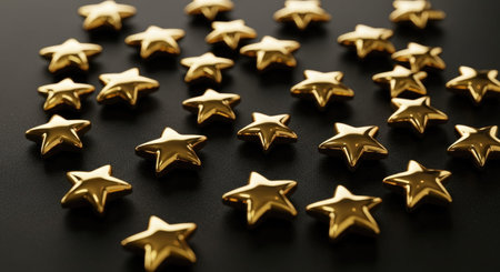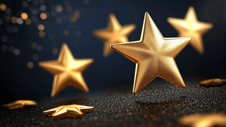 Close-up of shiny gold stars resting on a textured dark surface, symbolizing achievement and luxury.