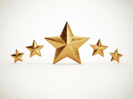 This image features a row of golden stars against a dark, sparkling background. The stars are three-dimensional and gleaming, creating a sense of luxury and achievement. The golden hue and the way the light reflects off the stars add to the overall elegance and sophistication of the image.
