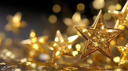 A captivating image showcasing shimmering golden stars illuminated by soft bokeh lights, perfect for celebratory themes and festive decorations.