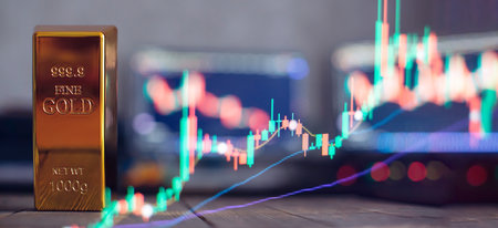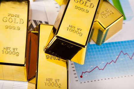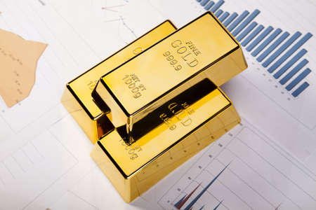 Photo of gold bars on graphs and statistics, studio shots, closeup