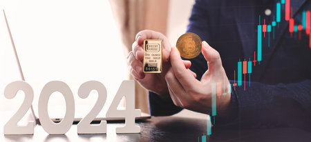 businessman buys gold and bitcoin in 2024 using digital technology and laptop computer.