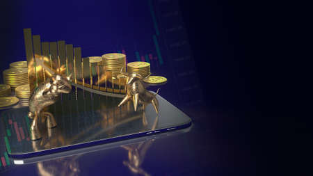 Stock exchange chart on smartphone screen, bell and hundred dollar bills blue background.Concept, stocks, business and finance