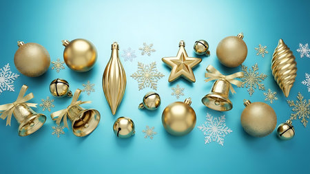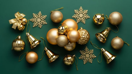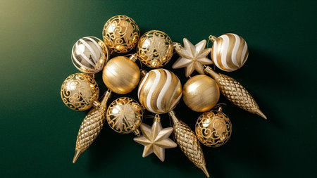 A beautiful collection of golden Christmas decorations laid out in an artistic arrangement, perfect for holiday themed projects, decor inspiration, and festive planning.