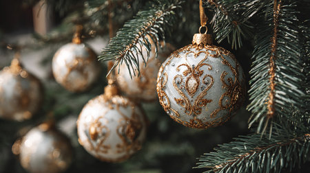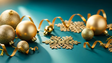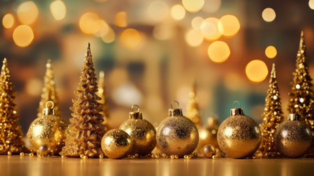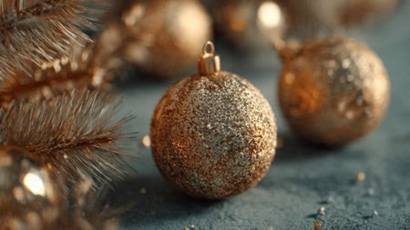 Various golden and transparent Christmas ornaments with decorative ribbons are displayed. The scene includes detailed textures and a blurred background creating a soft, warm ambiance. Suitable for a variety of holiday themed commercial and editorial projects.