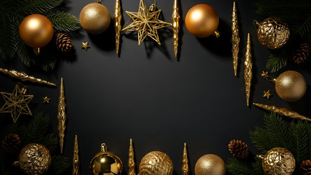 Pure-gold festive decorations displayed elegantly over a dark matte canvas.