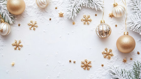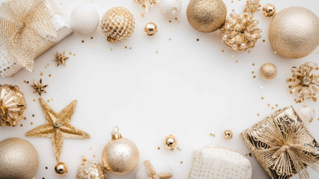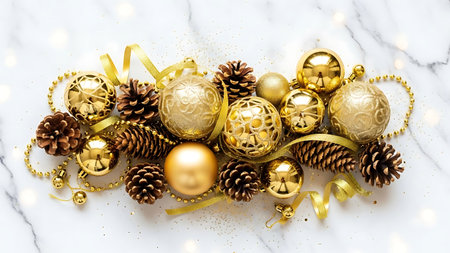 Elegant Holiday Decor with Golden Baubles and Glittering Embellishments on a Clean Backdrop