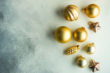 Christmas frame with holiday decor - golden xmas balls on white stone background with copy space