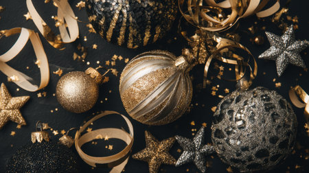 An exquisite collection of gold and black Christmas ornaments perfectly arranged, showcasing intricate designs and textures for a stunning holiday display or promotional use.