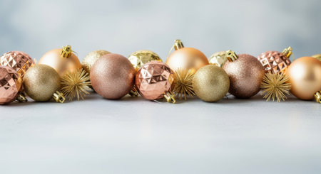 A collection of various golden and rose-colored Christmas ornaments arranged in a row, creating a festive and elegant display.
