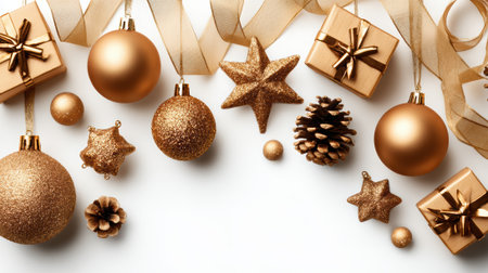A festive arrangement of golden Christmas ornaments, gift boxes, pinecones, and ribbons on a clean white surface, evoking holiday cheer.