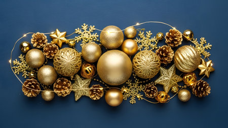 A collection of golden Christmas ornaments, pine cones, and snowflakes arranged on a dark blue background, creating a festive holiday display.