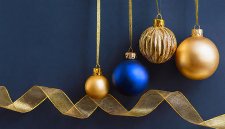 This visually stunning minimalistic background captures the essence of Christmas and New Year celebrations, showcasing elegant golden and blue glass balls gracefully hanging on ribbons, creating