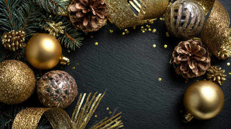 Celebrate the festive season with this elegant arrangement of golden ornaments, pine cones, and glittery ribbons on a dark slate background, perfect for holiday designs.