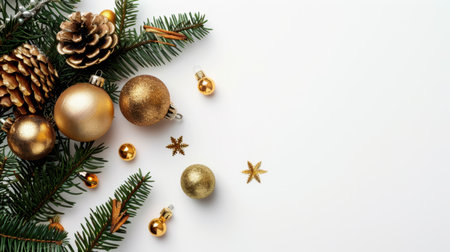 This image showcases an elegant Christmas decoration featuring golden ornaments, pine branches, and a pine cone on a pristine white background, perfect for holiday-themed designs.