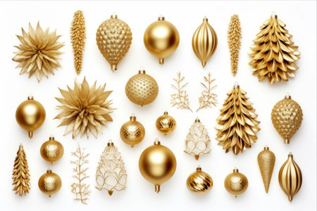 Shimmering Festive Ornaments: Exquisite Golden Christmas Decorations on White Background