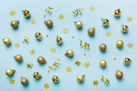 Golden christmas decoration on blue background. Christmas and New Year concept.
