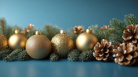 Golden ornaments rest on a blue background surrounded by pine branches and cones