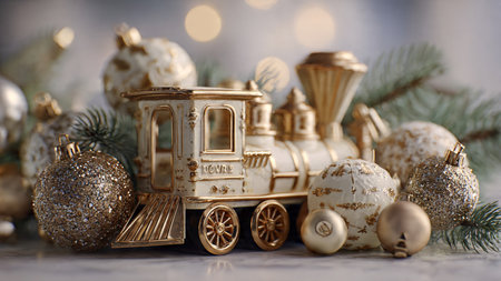 Vintage toy train with golden Christmas balls on a rustic background