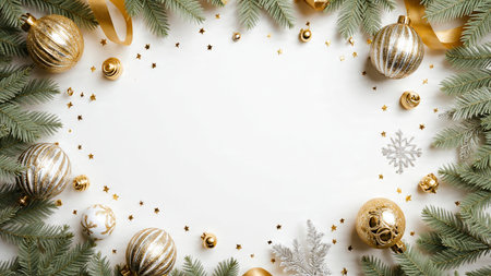 A calm white center bordered by pine greenery and sparkling gold-and-silver ornament clusters.