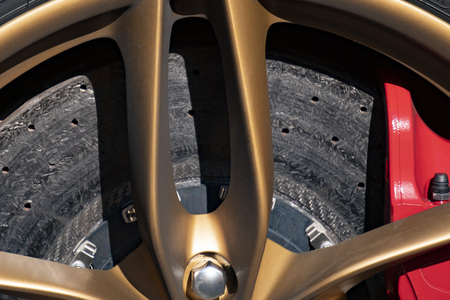 The brake system of a sport car,Car wheel - Close up of rims from a sports car , Part of modern new wheel car with disk brake pad