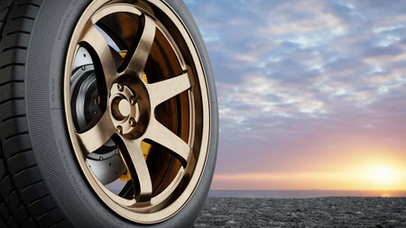 Performance gold car wheel with tire on sunset beach background 3D render illustration.