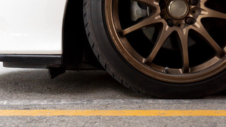 Down view of gold alloy wheels of sports cars. Car white color stop in the parking lot with yellow line on asphalt road.