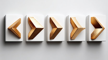 , high-angle view showcases five distinct, shiny, brushed metallic gold shapes resembling chevron or arrow segments. Each shape is recessed into a separate, rectangular white mounting block, casting subtle shadows on the light gray background, suggesting movement or sequence.