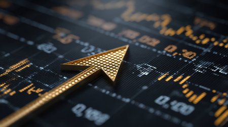 Golden arrow pointing upwards on digital stock market background, symbolizing growth and success in finance. vibrant colors and intricate details enhance visual appeal