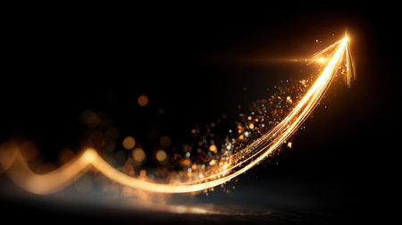 Shimmering golden arrows rise upward, symbolizing growth and success against dark background filled with sparkling particles. This captivating image evokes sense of aspiration and achievement