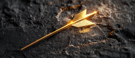 A glowing golden arrow lies on textured dark surface, symbolizing strength, precision, and breaking barriers