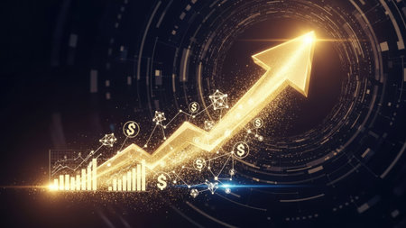 An upward pointing arrow composed of bright particles dominates the frame, suggesting growth and financial success. The image presents a chart with ascending bars and dollar signs, all set against a dark, tech-inspired background. Ideal for illustrating concepts of business, investments, and progress in diverse commercial contexts.