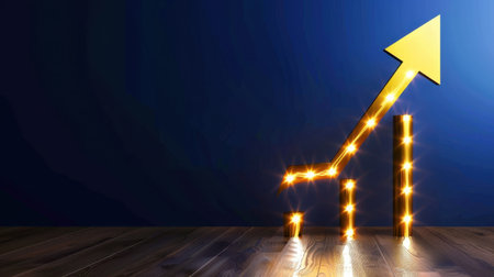 This vibrant image features a glowing golden arrow signifying upward growth emerging from a bar graph on a wooden surface. Ideal for business themes.