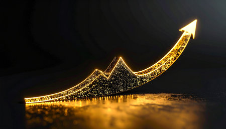 An upward gold arrow sparkles amidst a shower of golden particles, conveying a dynamic atmosphere of rising success and economic growth against a dark backdrop.