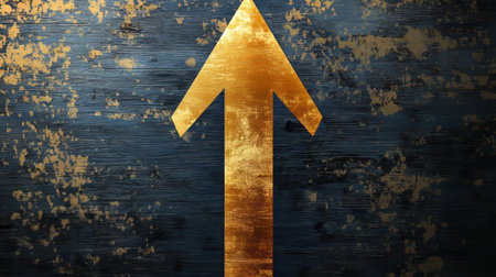Golden upward arrow on a dark textured background, representing success and prosperity concepts.