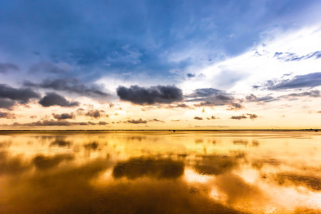 Sunset over the sea with clouds reflected in the water. Beautiful seascape.